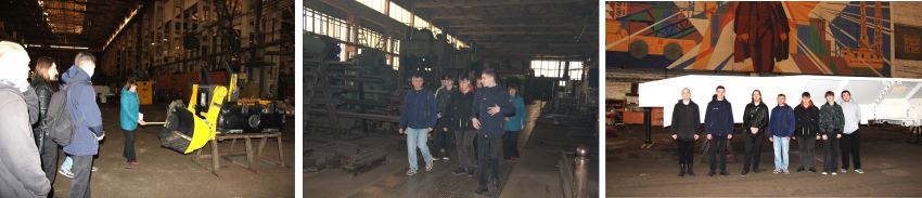 Инженер-технолог Любовь Константиновна Арапова провела для ребят увлекательную экскурсию с рассказом о жизни завода и заводчан. Студенты побывали в музее завода, познакомились с богатой 87-летней историей предприятия. Посетили производство обогатительного оборудования и гидравлики, цеха: механообрабатывающий, металлоконструкций, литейный, сборочный, резинопластмассовых изделий. Они увидели в цехах изготовление буровых станков, шахтного самоходного вагона, грохотов, сепараторов, пластмассовых кресел, резинотехнических изделий. Сфотографировались на память у мемориального комплекса «Легендарное оружие Победы».